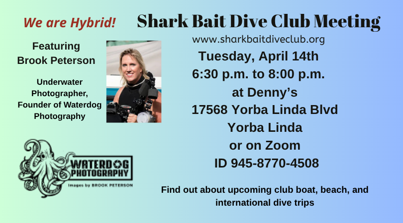 Join us at our monthly meeting with our invited guest speakers. Our club speaker this month is acclaimed underwater photographer Brook Peterson of Waterdog Photography. Learn some new pro tips from an expert! Catch up with fellow divers and sign up for beach dives, boat dives, and international trips. Family friendly! Go to our website for our newsletter and more information about the club.
